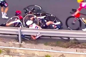 女子自行车赛频频摔车,车手避让不及冲下2米高护栏摔致昏迷